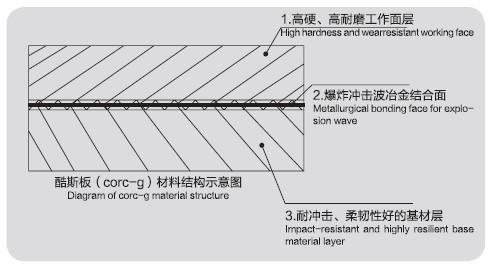 酷斯板(corc-g)選用高硬、高耐磨的材料作工作面,選用耐沖擊力、柔韌性較好的材料作基材,通過(guò)爆炸焊接的方法,讓兩種性能相異的材料頑固的結(jié)合在一起,制成新的高耐磨襯板材料,該材料制成的襯板經(jīng)熱處理后既具有較高的硬度與耐磨性,又具有較好柔韌性和耐沖擊力。